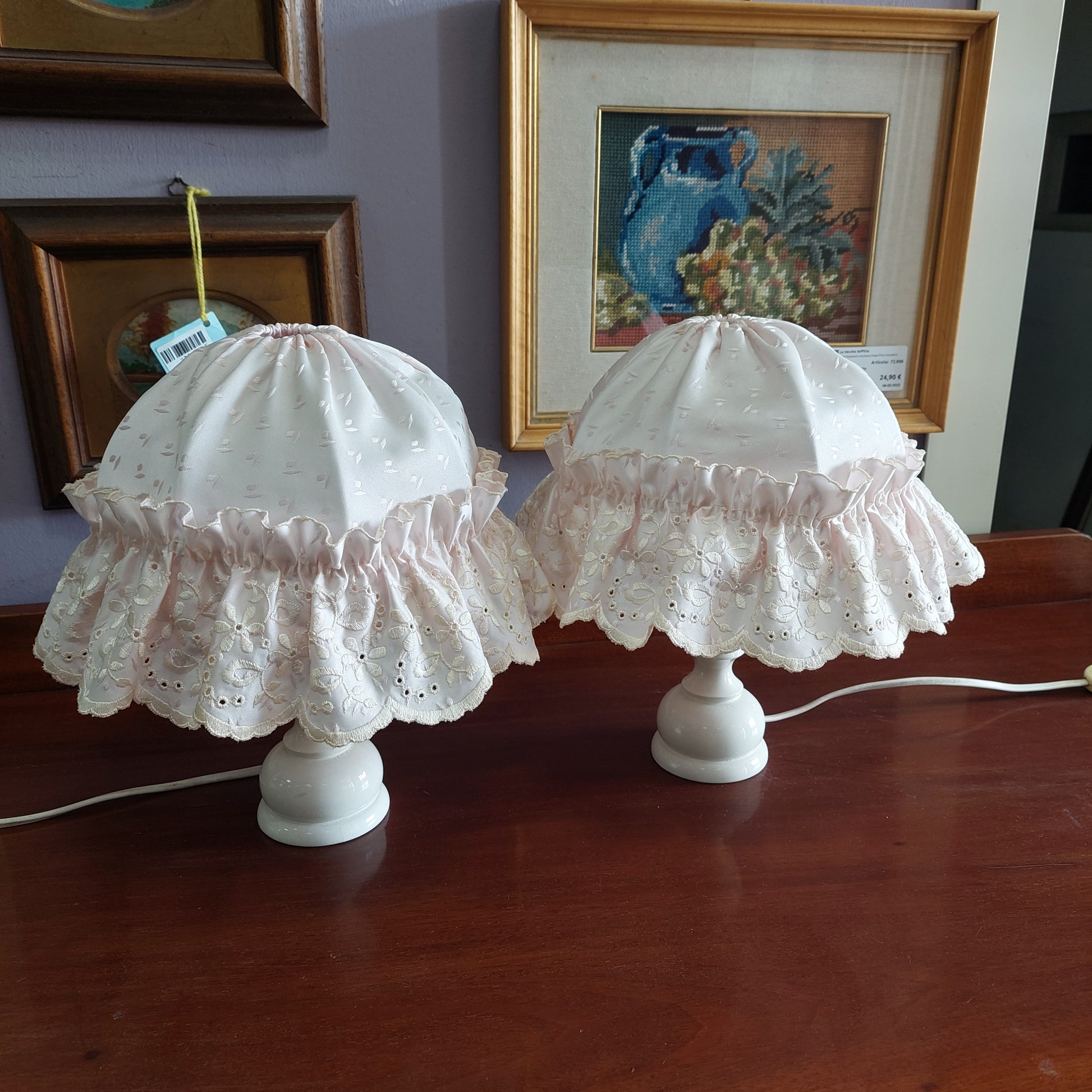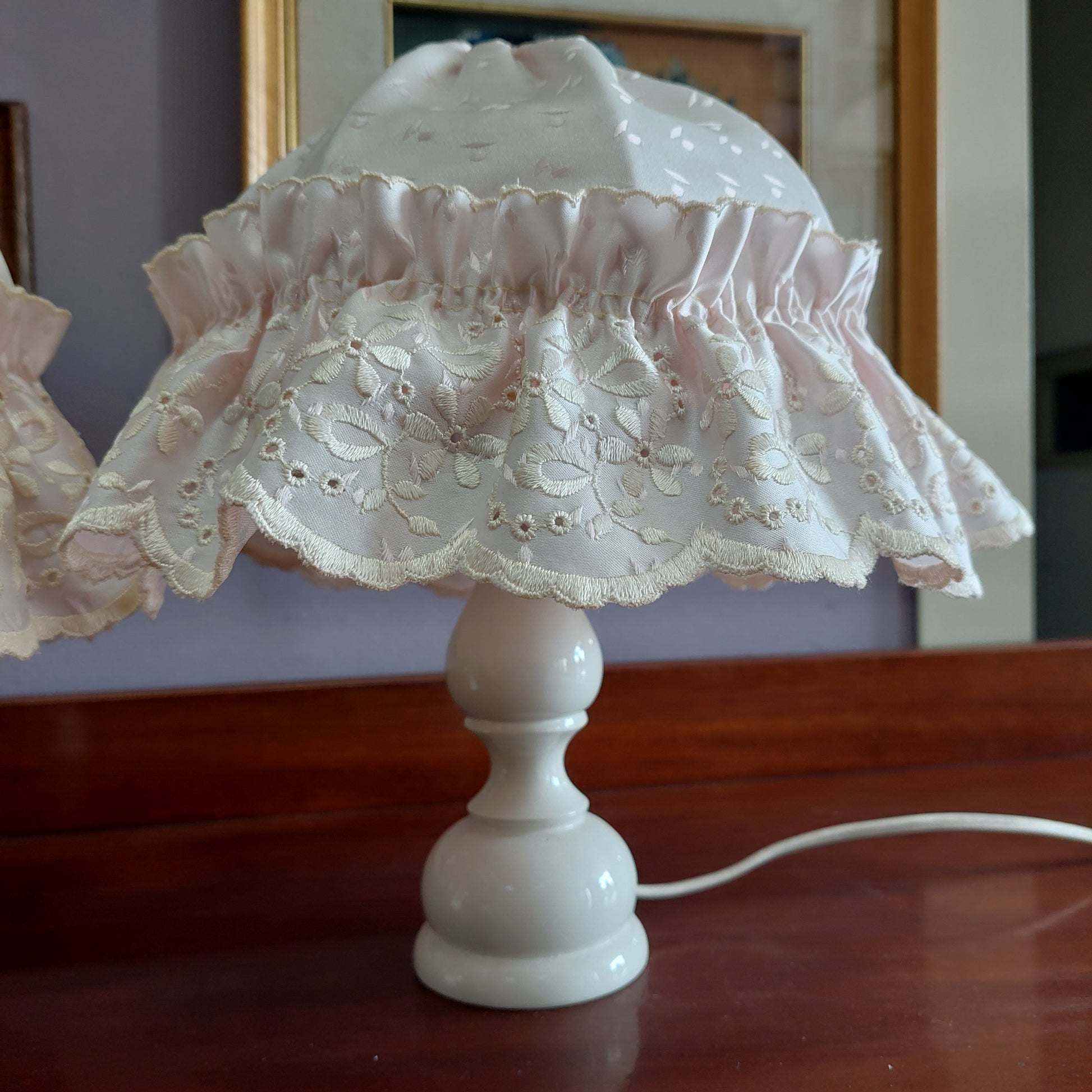 Coppia Abat Jour Legno Bianco Volant Rosa