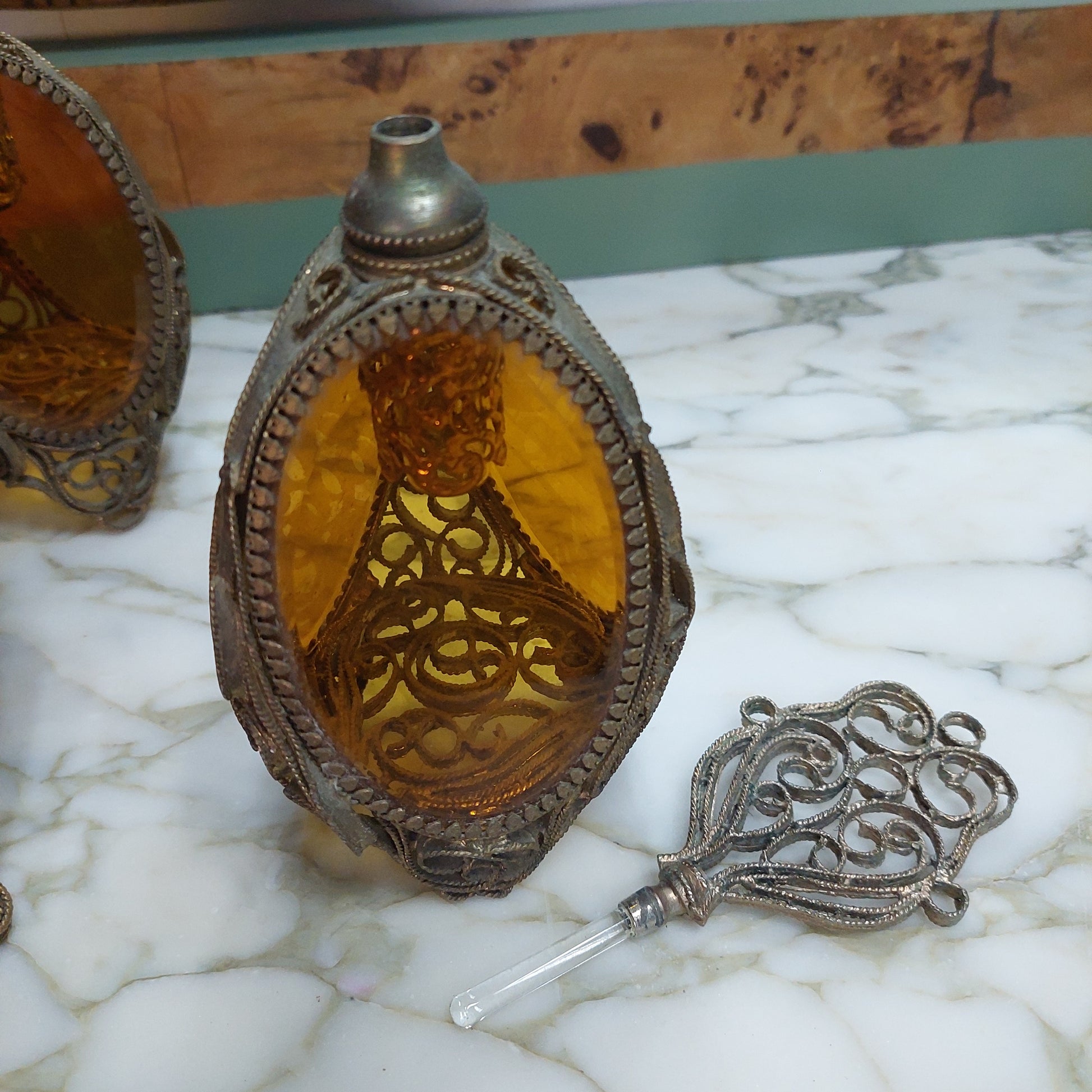 SET / 4 PEZZI DA TOELETTA LIBERTY ART DECO' '900 IN FILIGRANA D'OTTONE 2 PORTA PROFUMO + PORTA GIOIE E SVEGLIA GUILD CREST (non funzionante)