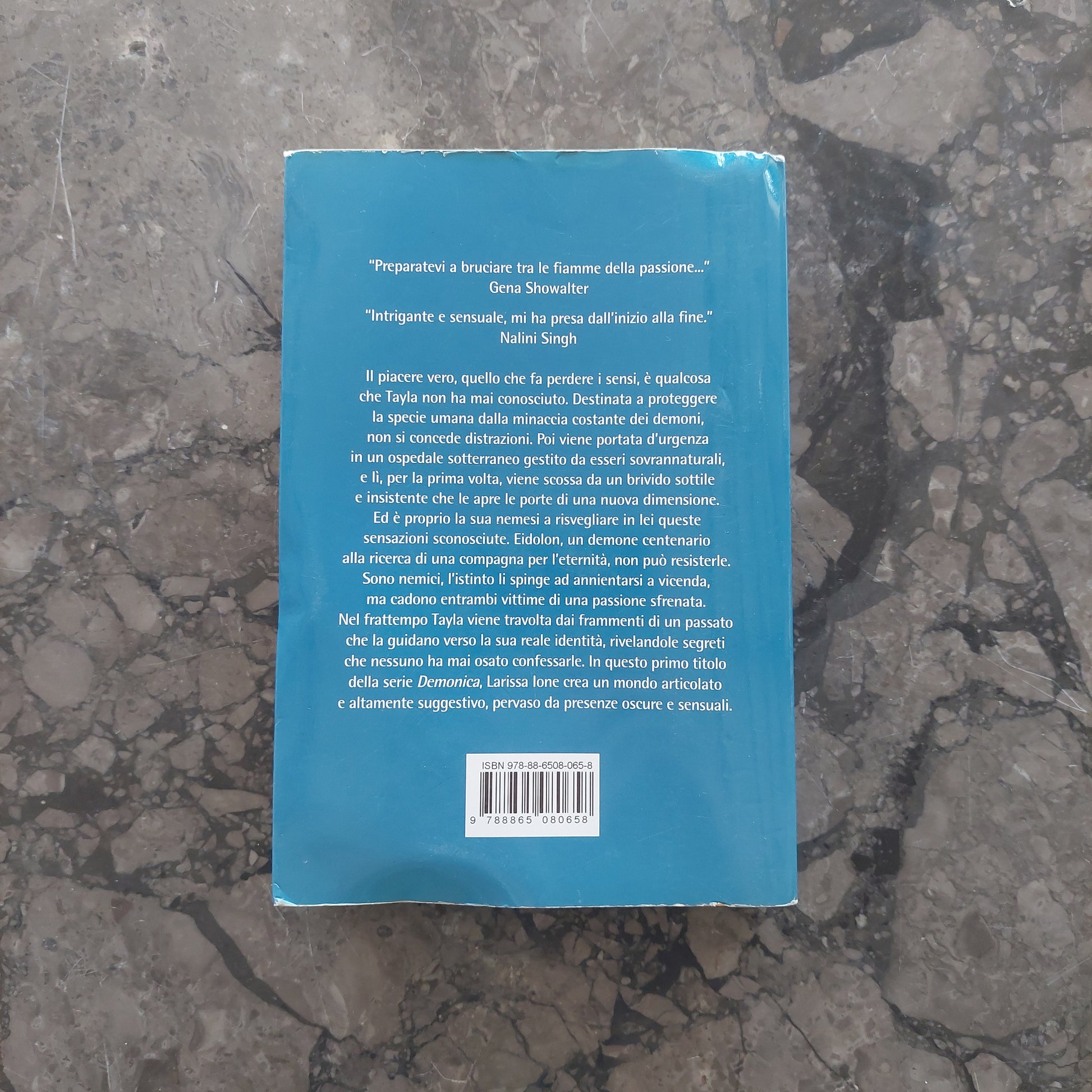 Il piacere vero, quello che fa perdere i sensi, è qualcosa che Tayla non ha mai conosciuto. Destinata a proteggere la specie umana dalla minaccia costante dei demoni, non si concede distrazioni. Poi viene portata d'urgenza in un ospedale sotterraneo gestito da esseri sovrannaturali, e lì, per la prima volta, viene scossa da un brivido sottile e insistente che le apre le porte di una nuova dimensione. Ed è proprio la sua nemesi a risvegliare in lei queste sensazioni sconosciute. Eidolon, un demone centenario alla ricerca di una compagna per l'eternità, non può resisterle. Sono nemici, l'istinto li spinge ad annientarsi a vicenda, ma cadono entrambi vittime di una passione sfrenata. Nel frattempo Tayla viene travolta dai frammenti di un passato che la guidano verso la sua reale identità, rivelandole segreti che nessuno ha mai osato confessarle. In questo primo titolo della serie Demonica, Larissa Ione crea un mondo articolato e suggestivo, pervaso da presenze oscure e sensuali.