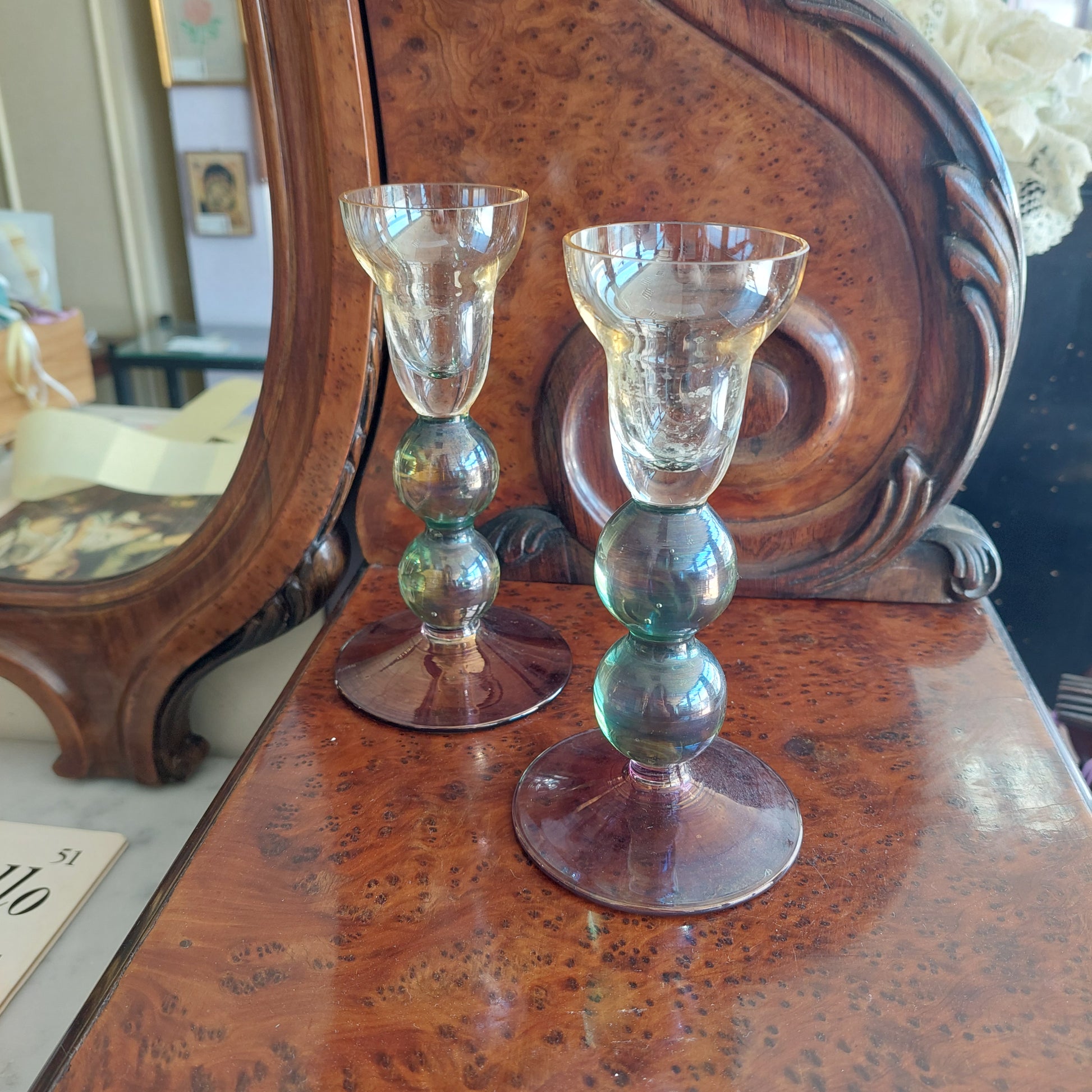 Coppia porta candele vetro di Murano, sfumature verde/viola. Misure d8x16h