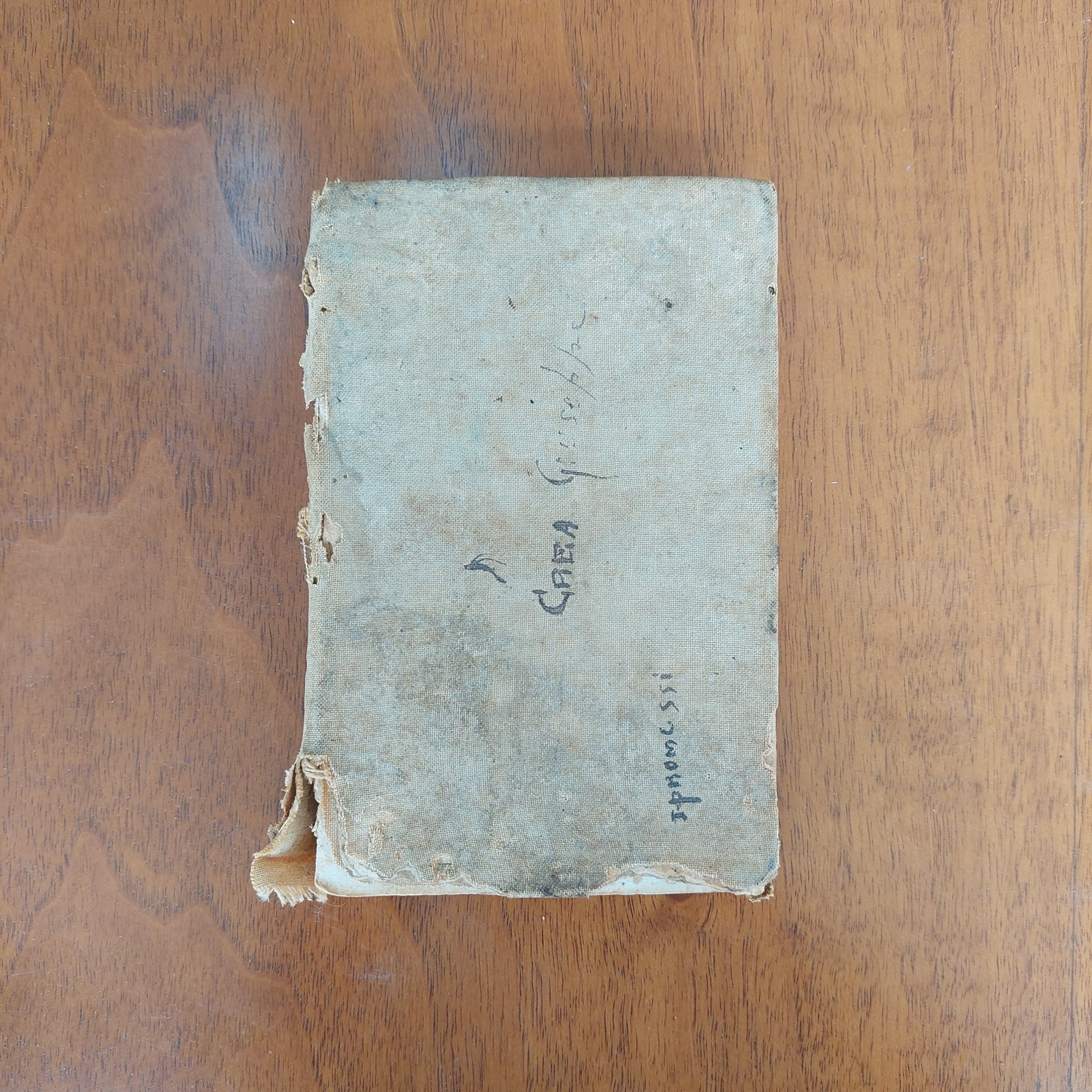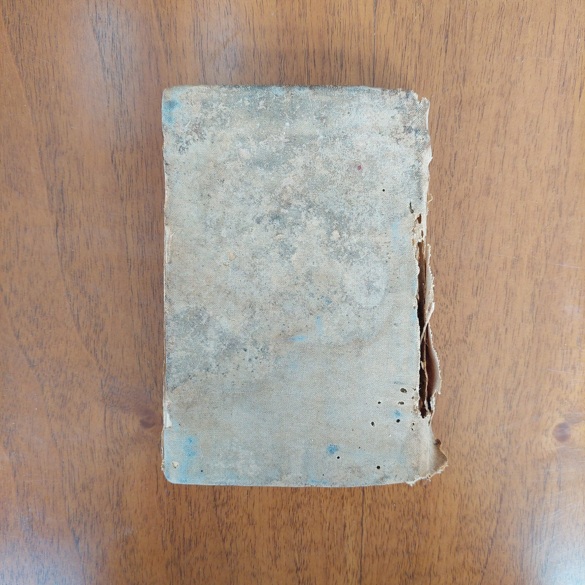 Vecchio libro rilegato artigianalmente presenta diversi segni di tarme della carta