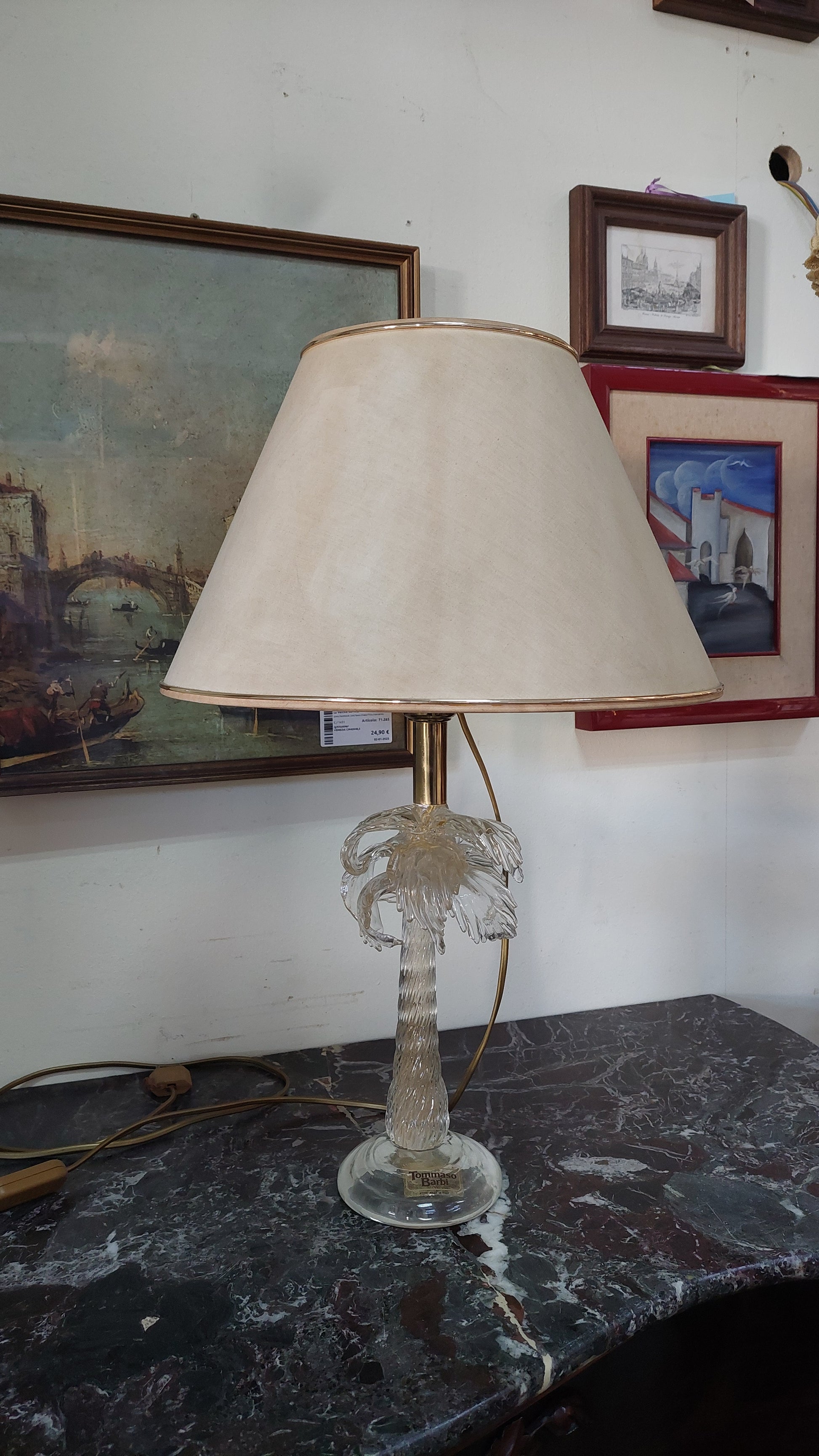 Lampada vetro di Murano Tommaso Barbi, paralume beige filo dorato