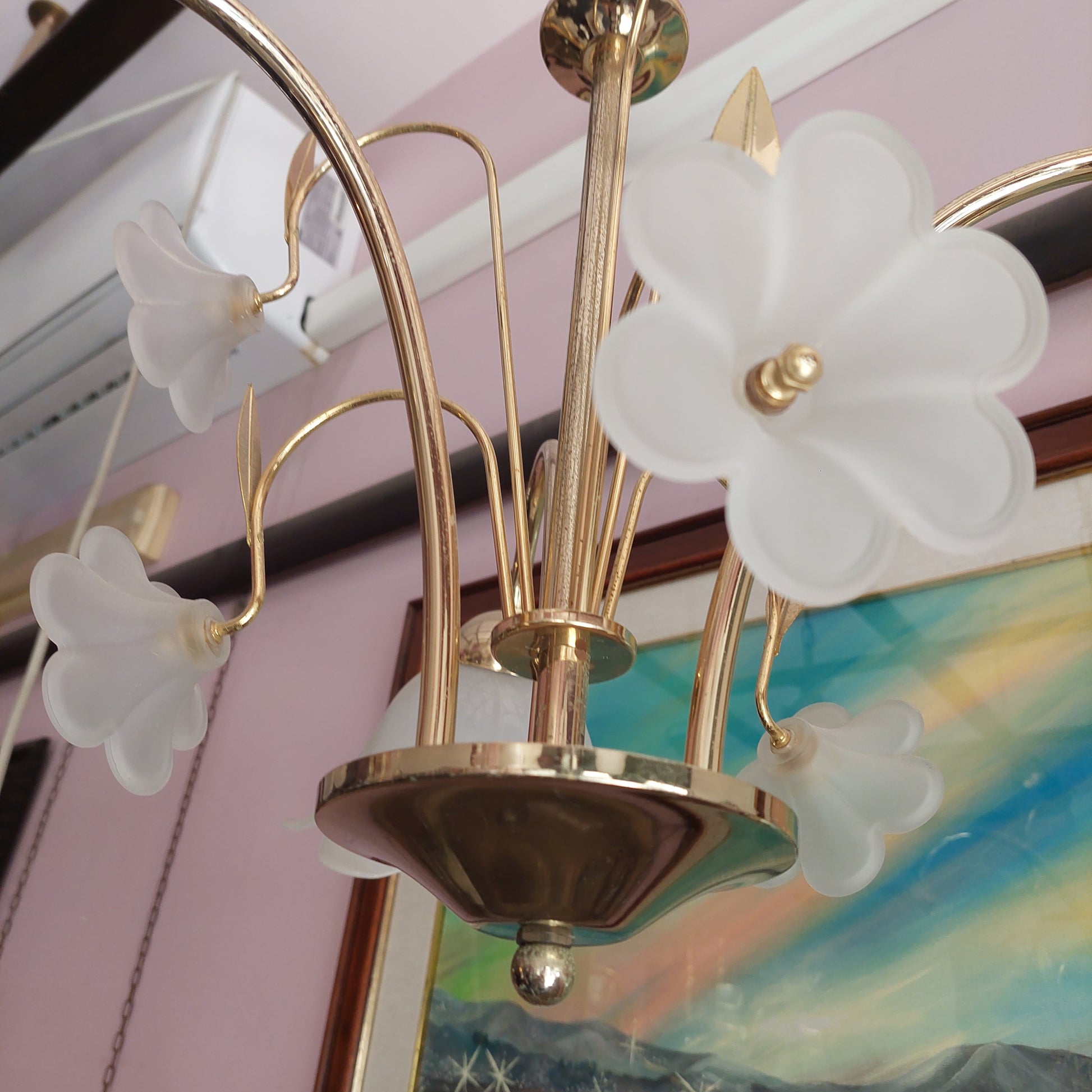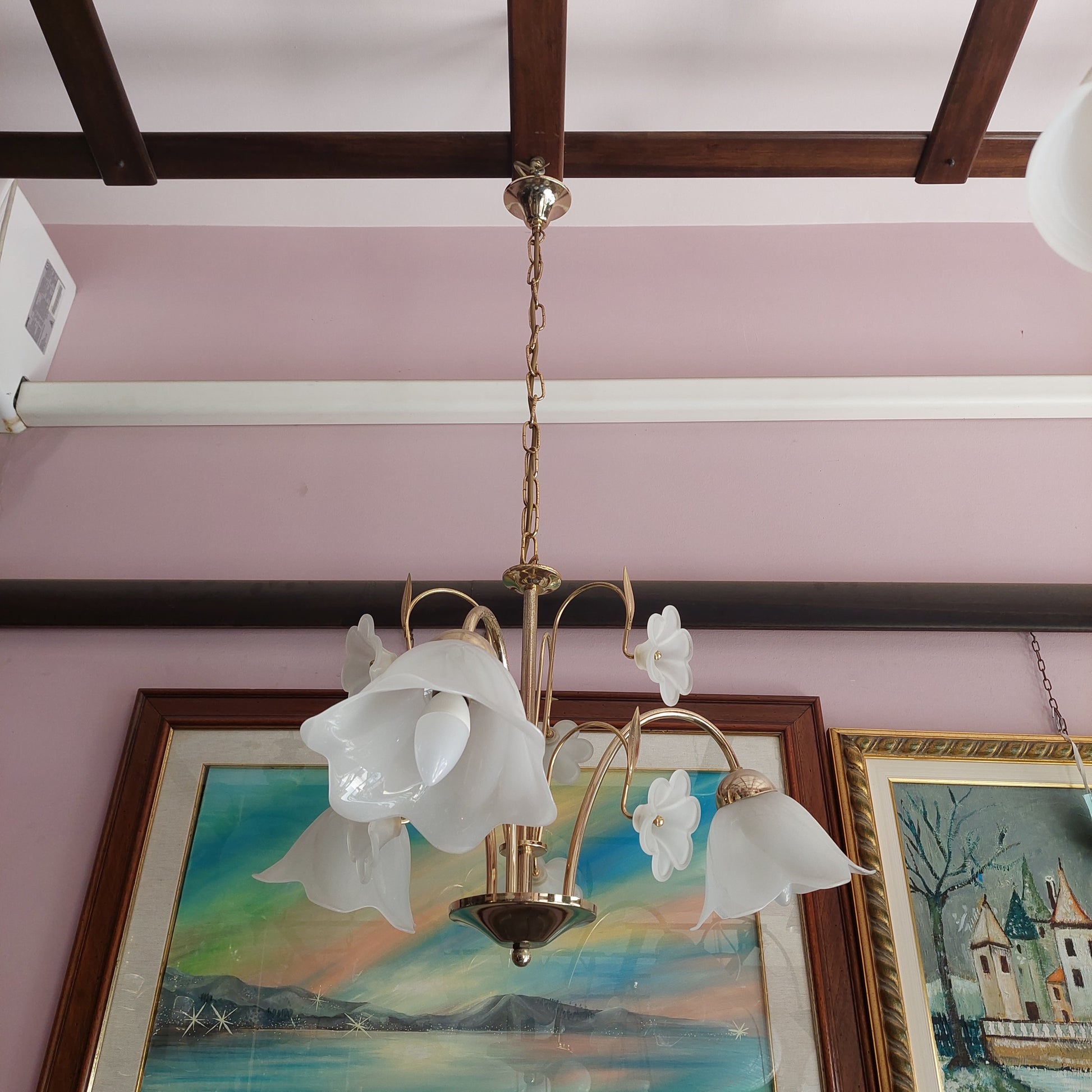 Lampadario Ottone Coppette Fiore Vetro 3 Luci