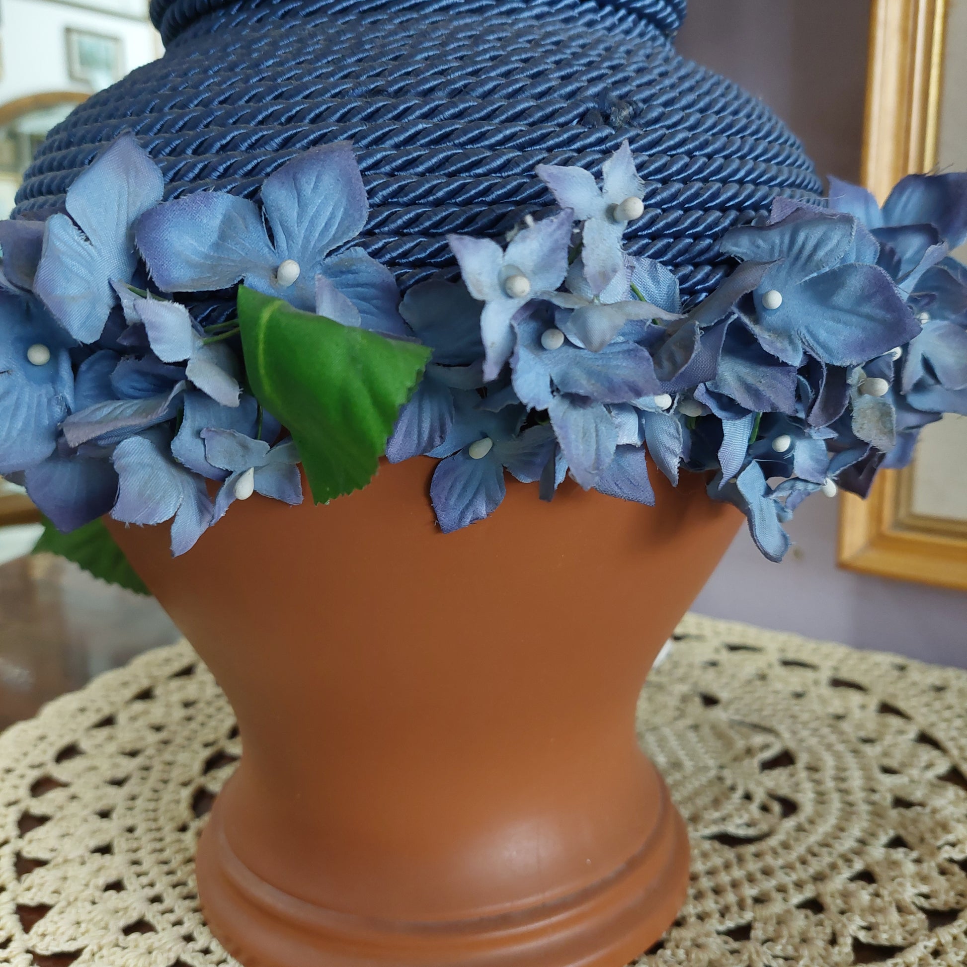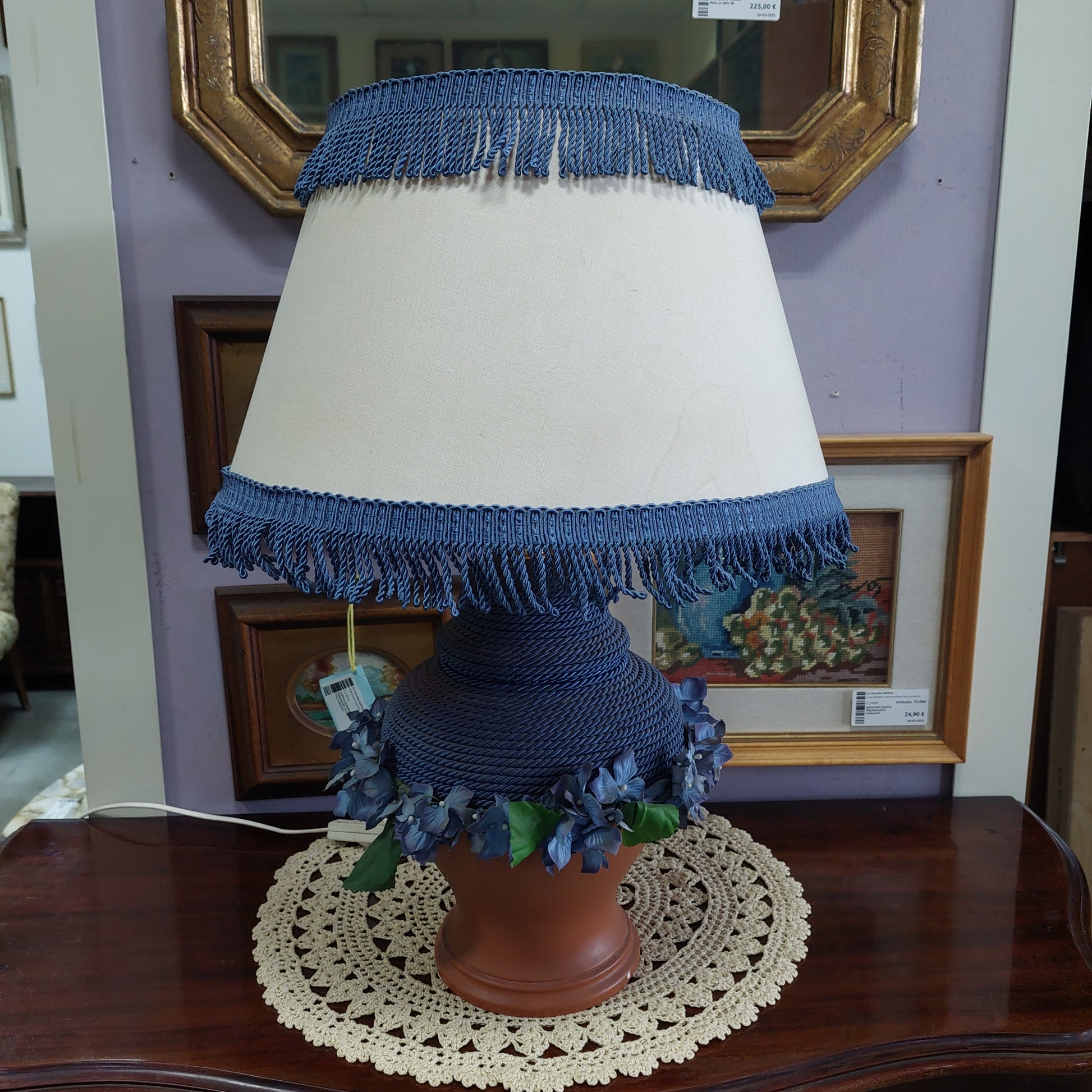 Lume terracotta* con paralume beige decori corda e fiori blu h60cm