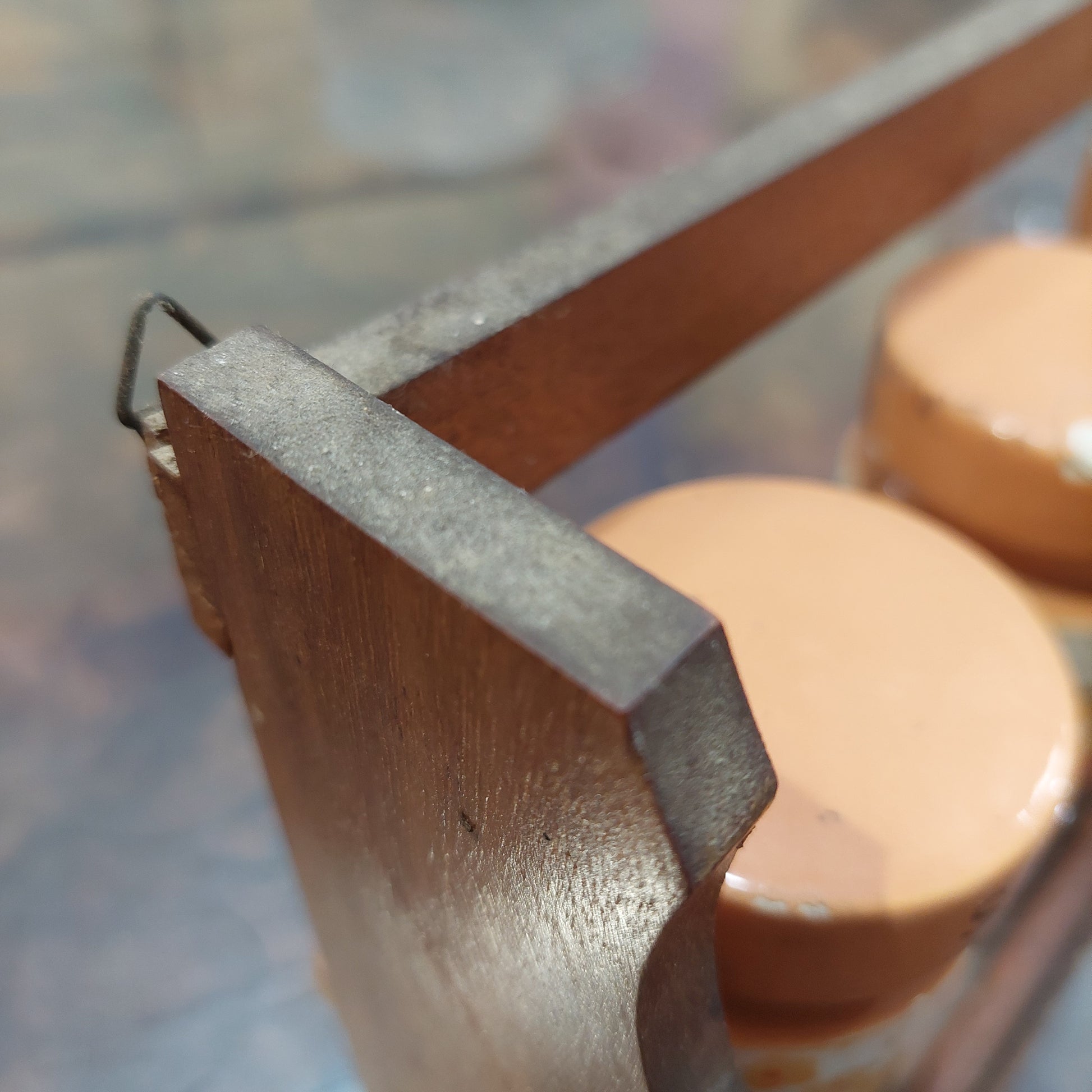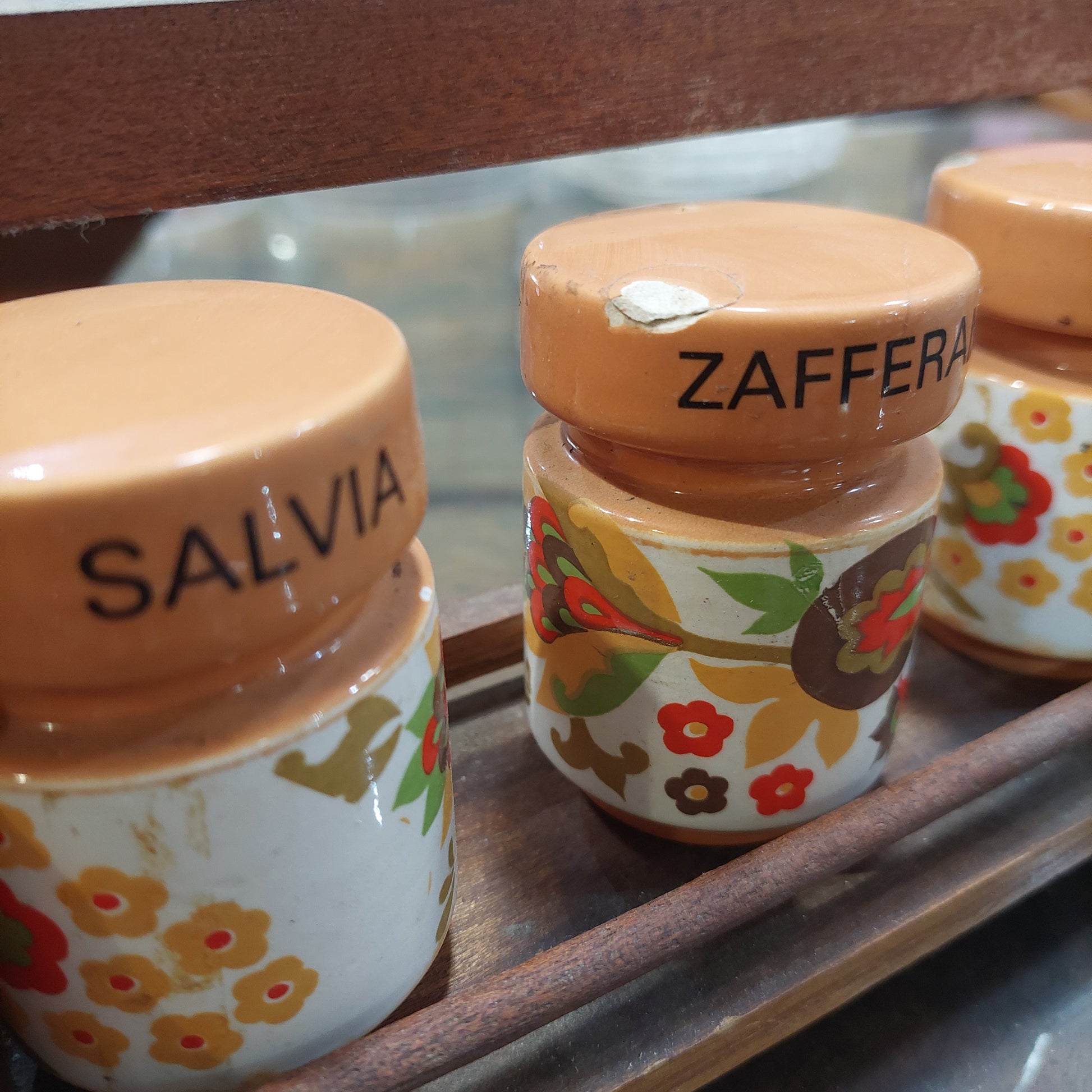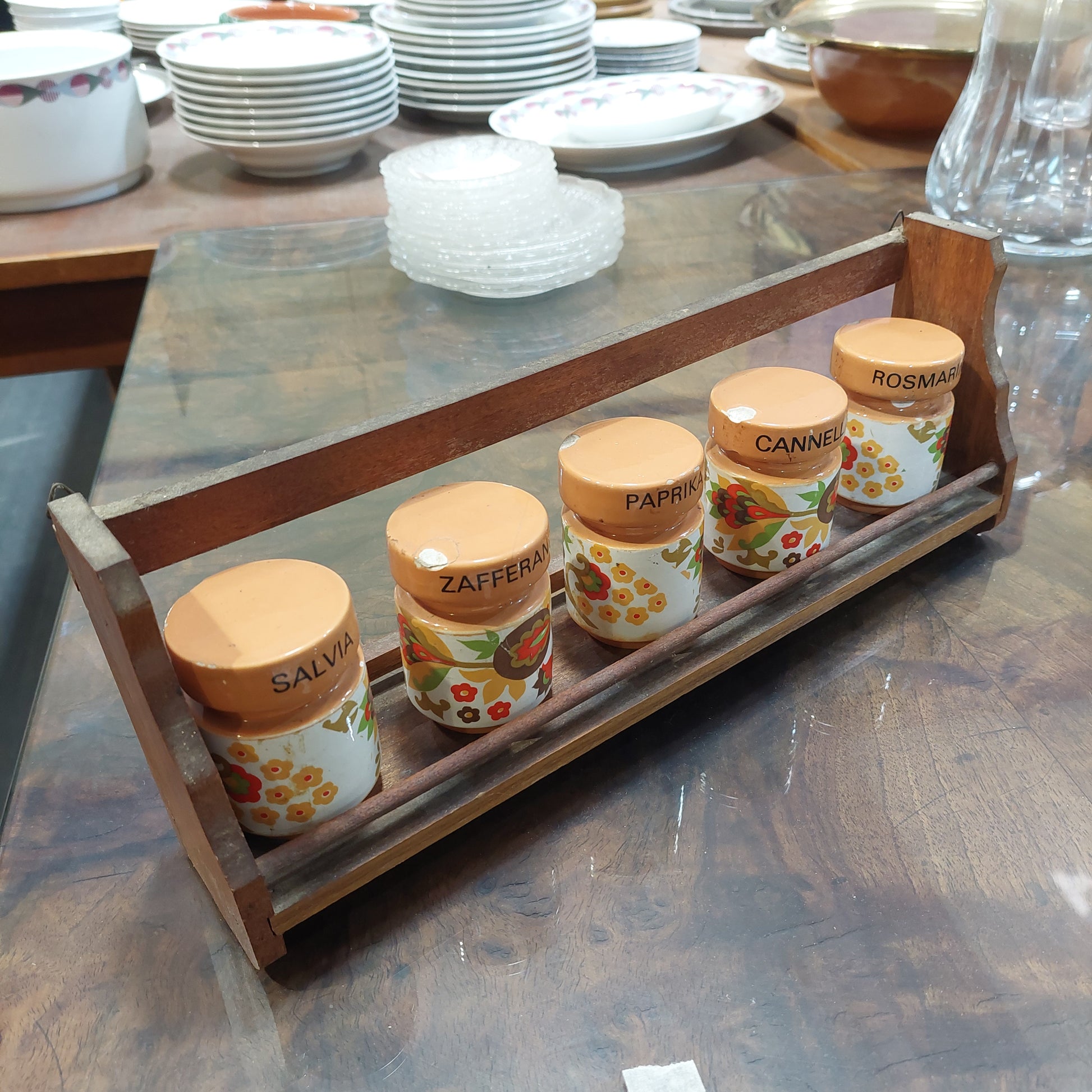 MENSOLINA LEGNO PORTA SPEZIE CON 5 BARATTOLINI ARTE CERAMICA* ROMANA ITALY VINTAGE