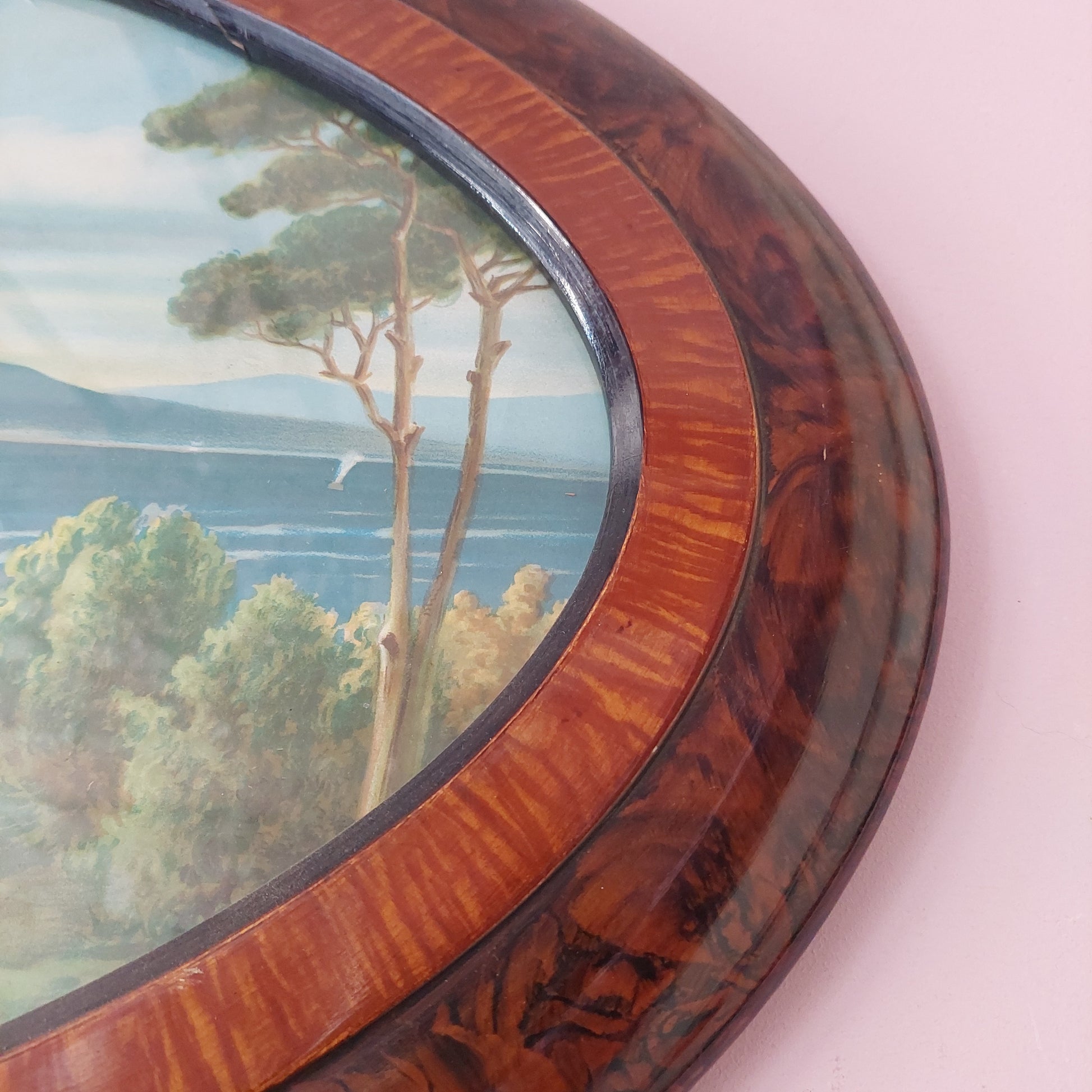 Quadro Capezzale vintage "Ave Maria" sfondo Vesuvio, cornice radica di noce ovale cm87x50