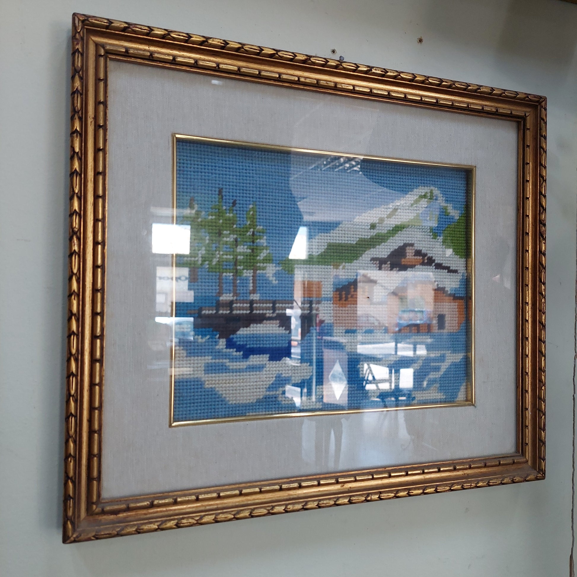 Quadro mezzopunto case innevate cornice legno oro cm38x33
