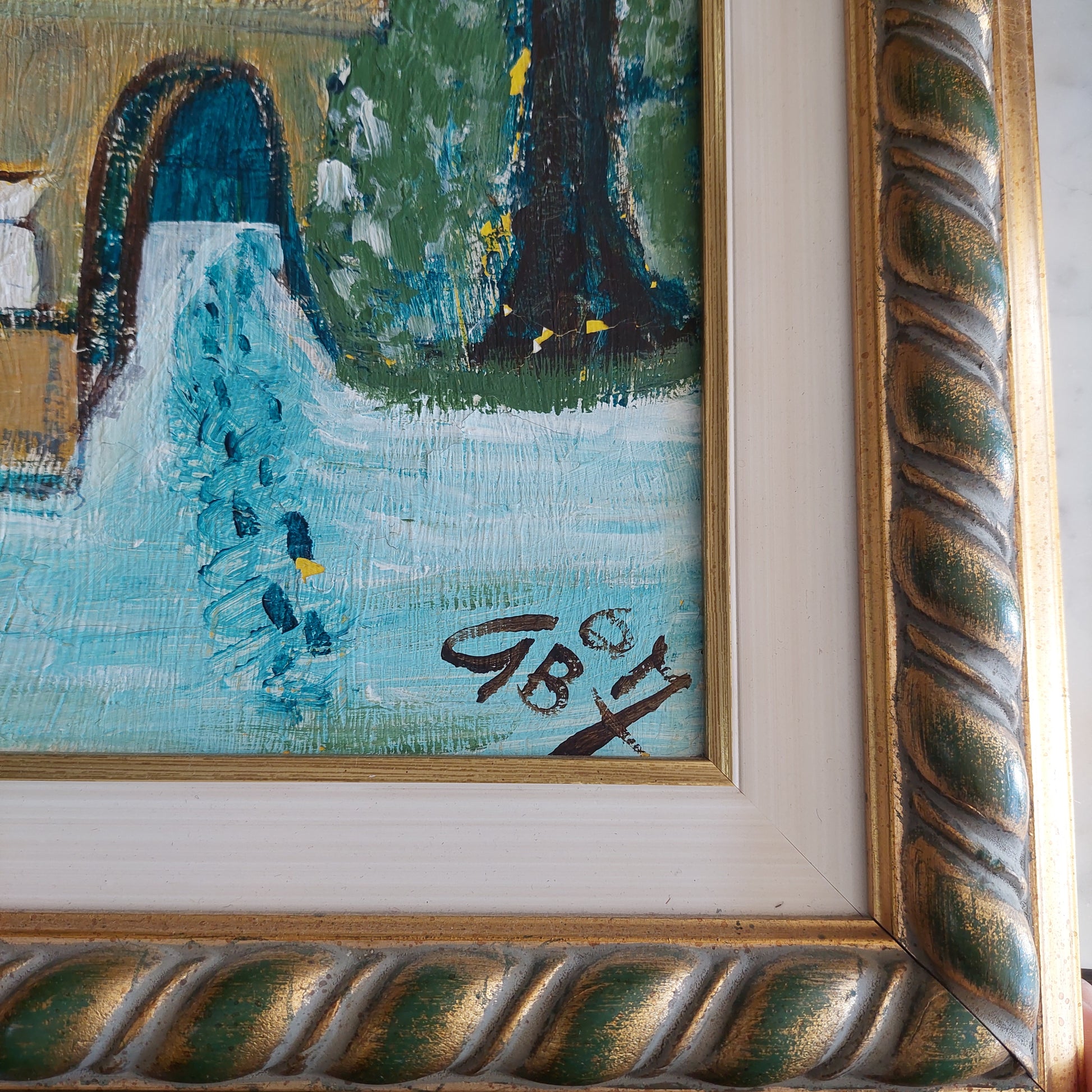 Quadro paesino montano olio* su tela firmato G B 87. Cornice legno oro/verde misure cm62,5x52,5