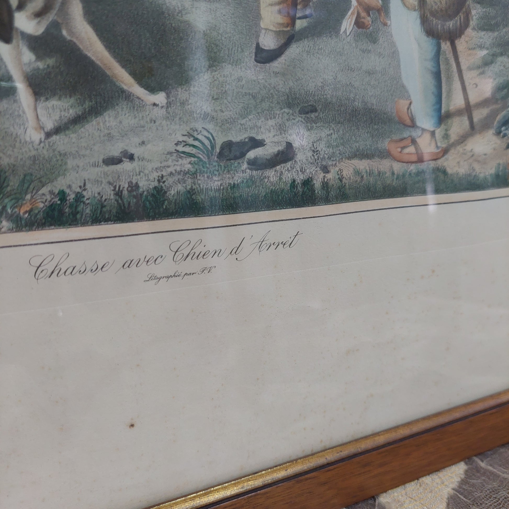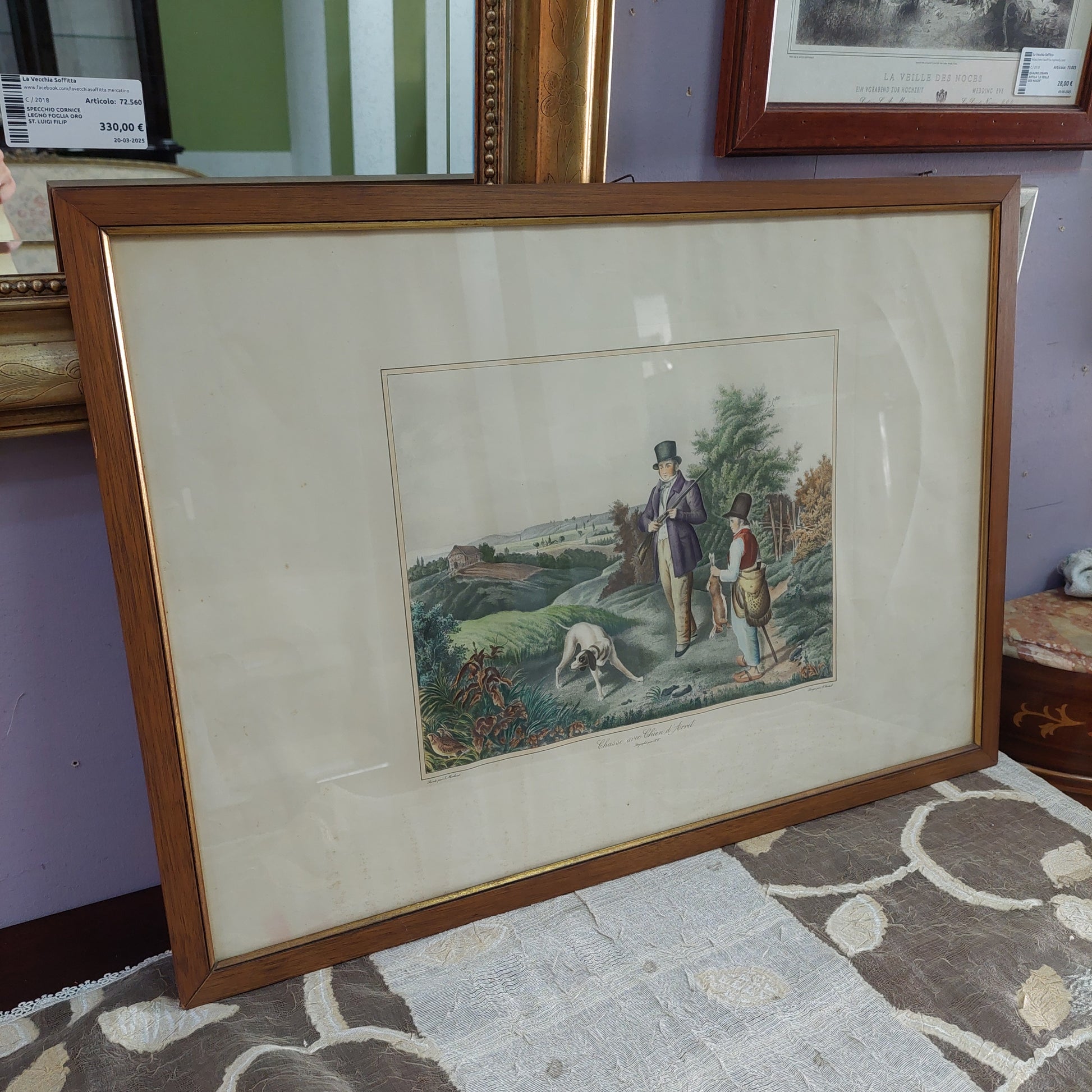 Quadro stampa antica scena di caccia "chasse avec chien d'arrêt" Morland Suntach cm71x51