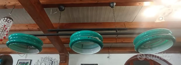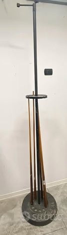 Completo di lampadario a 3 luci, rastrelliera porta stecche, 2 tabelloni conta punti, 5 stecche tutto marca Restaldi, triangolo, set di palline, birilli e gessetti e telo copri biliardo (da ricucire).