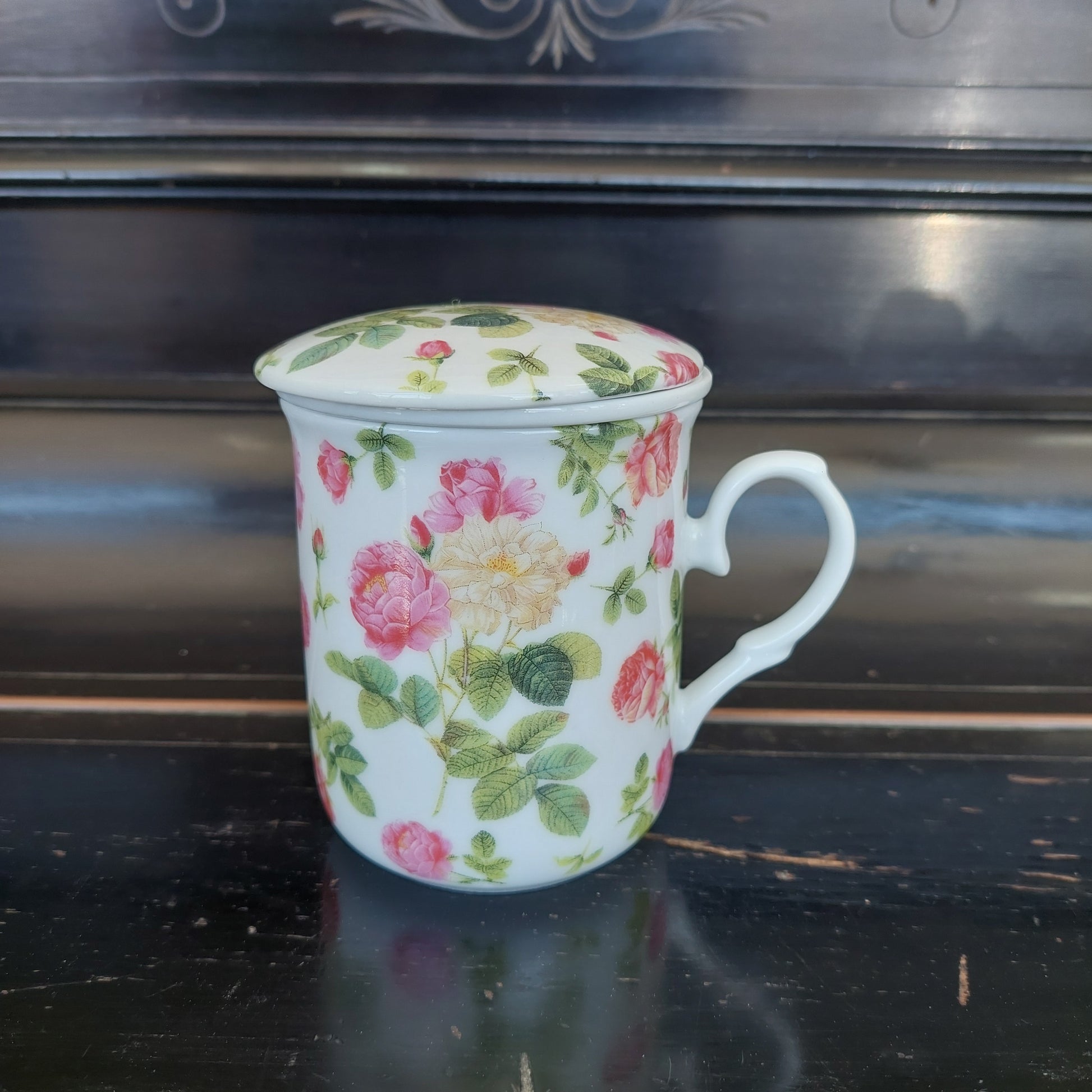 tazza thè tisaniera con filtro e coperchio porcellana rtdecor "il rustico trend" decoro rose.